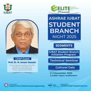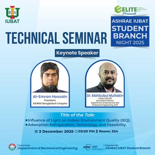 The ASHRAE IUBAT Student Branch, with support from the Department of Mechanical Engineering, is organizing a Technical Seminar, Initiation Program, and Cultural Gala on 3 December 2025.