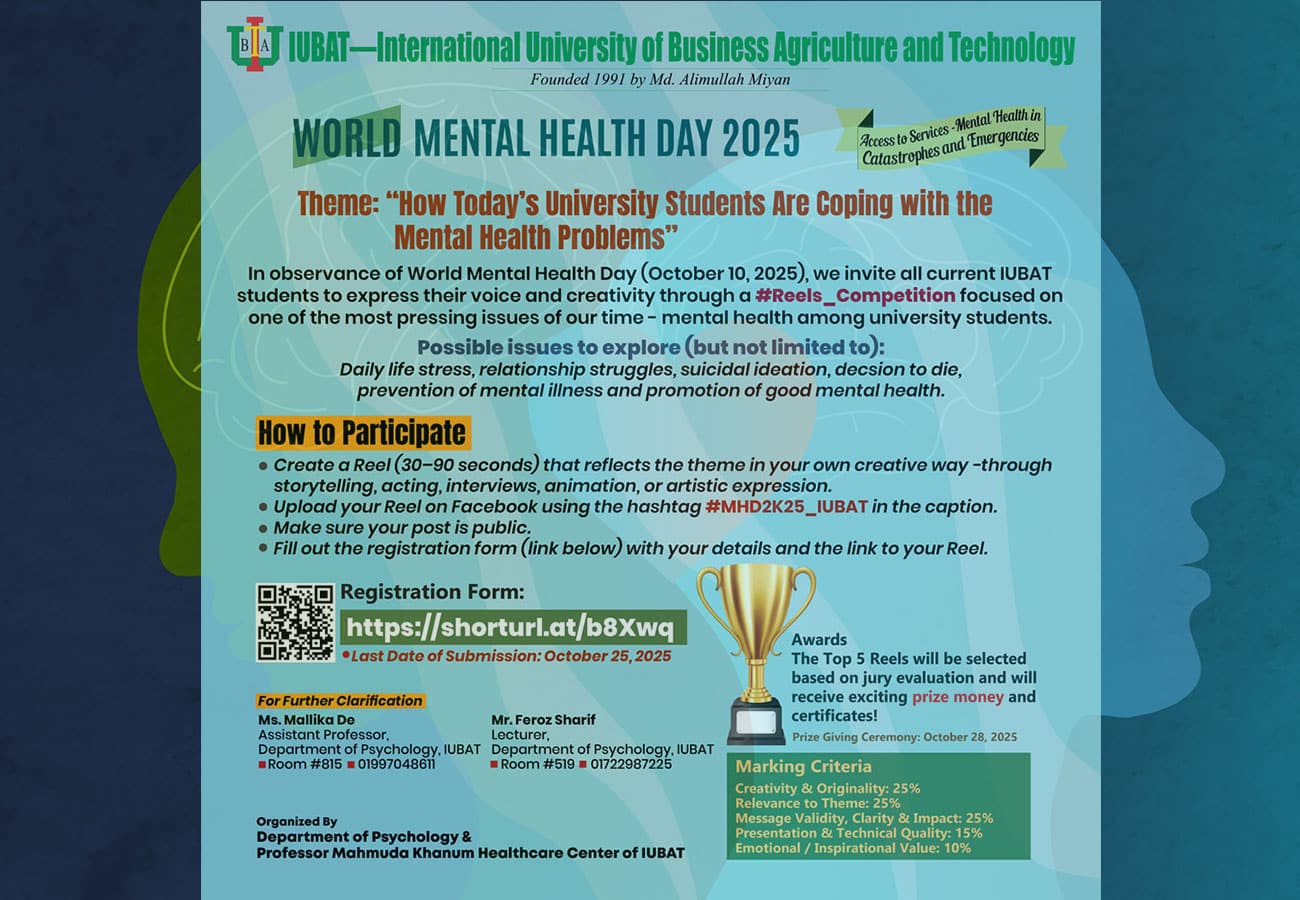 In observance of World Mental Health Day (October 10, 2025), we invite all current IUBAT students to express their voice and creativity through a #Reels_Competition focused on one of the most pressing issues of our time – mental health among university students.